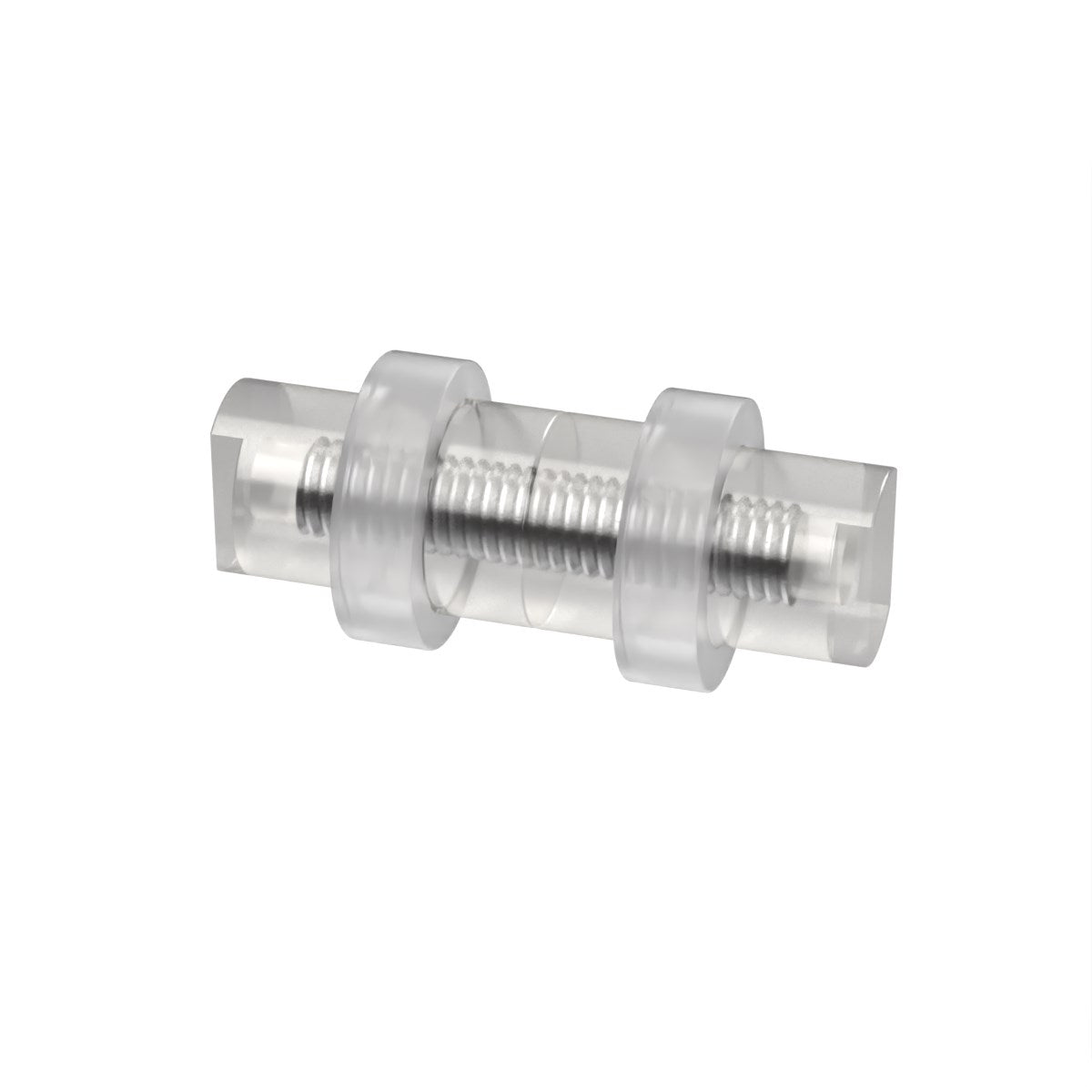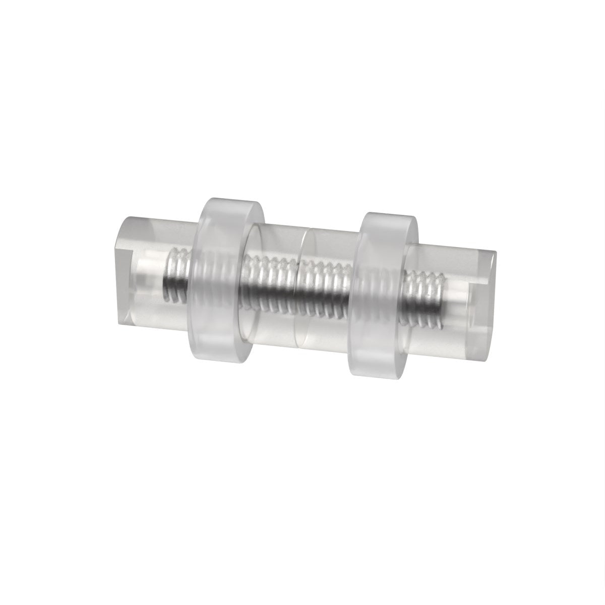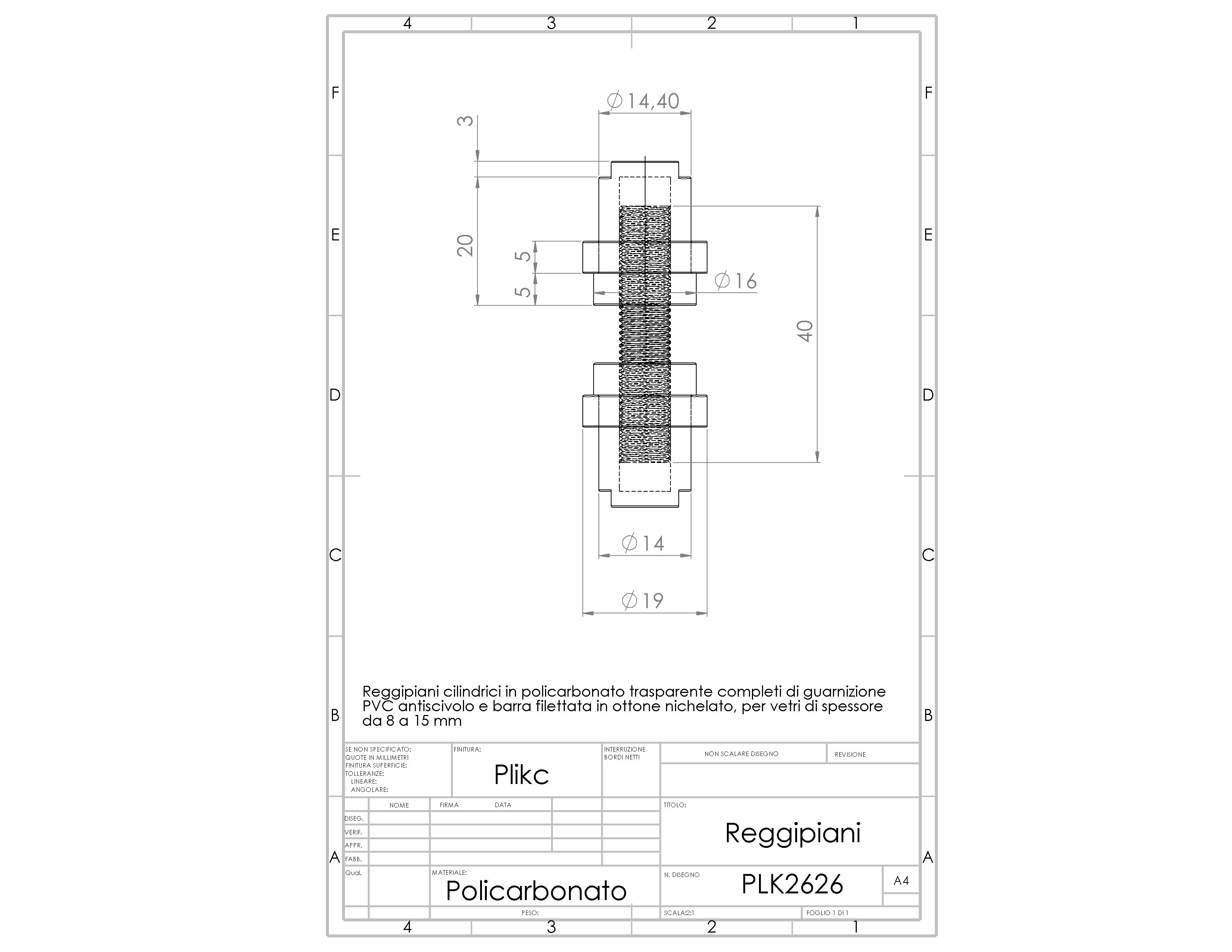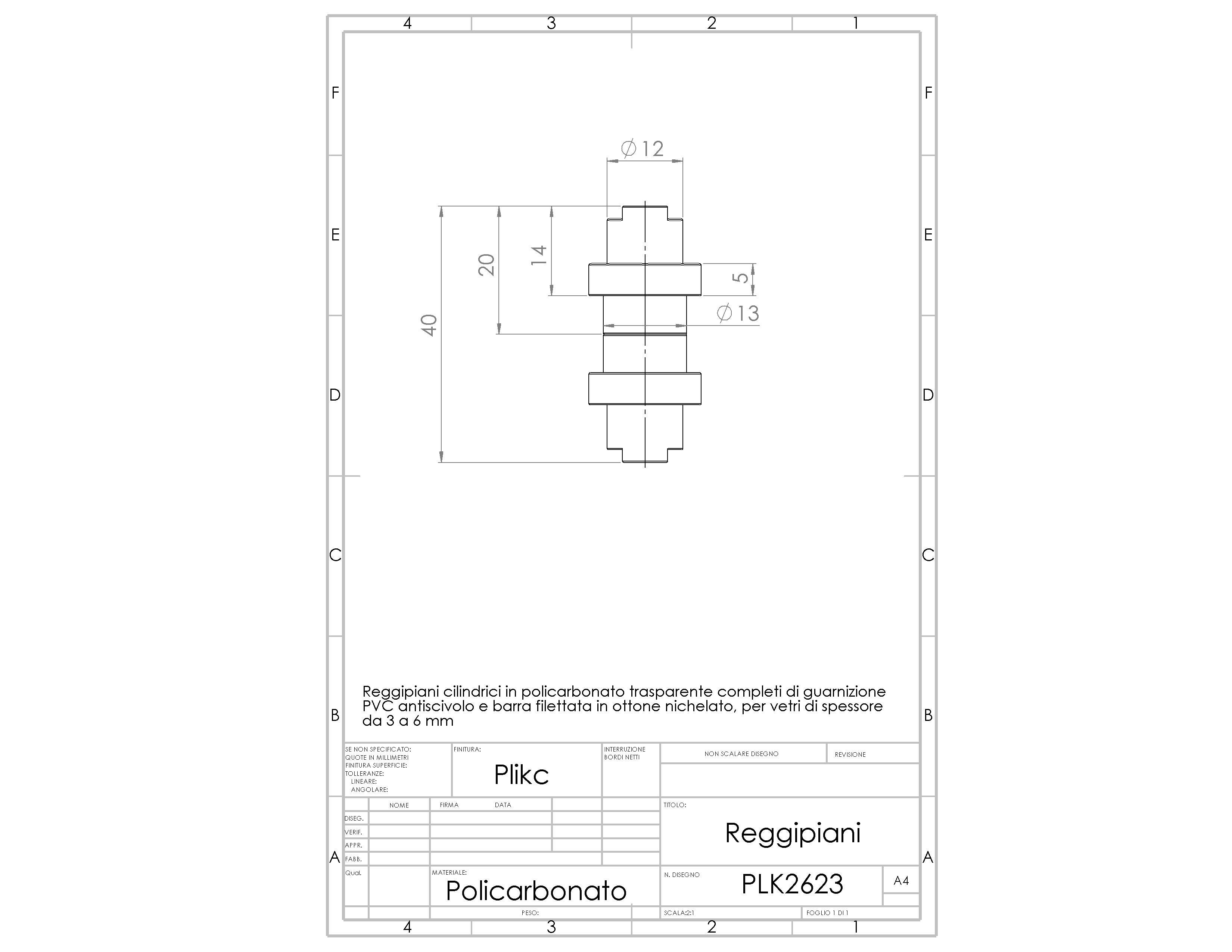 Reggipiani cilindrico per vetri in policarbonato trasparente completi di guarnizione in PVC antiscivolo e barra filettata in ottone nichelato.