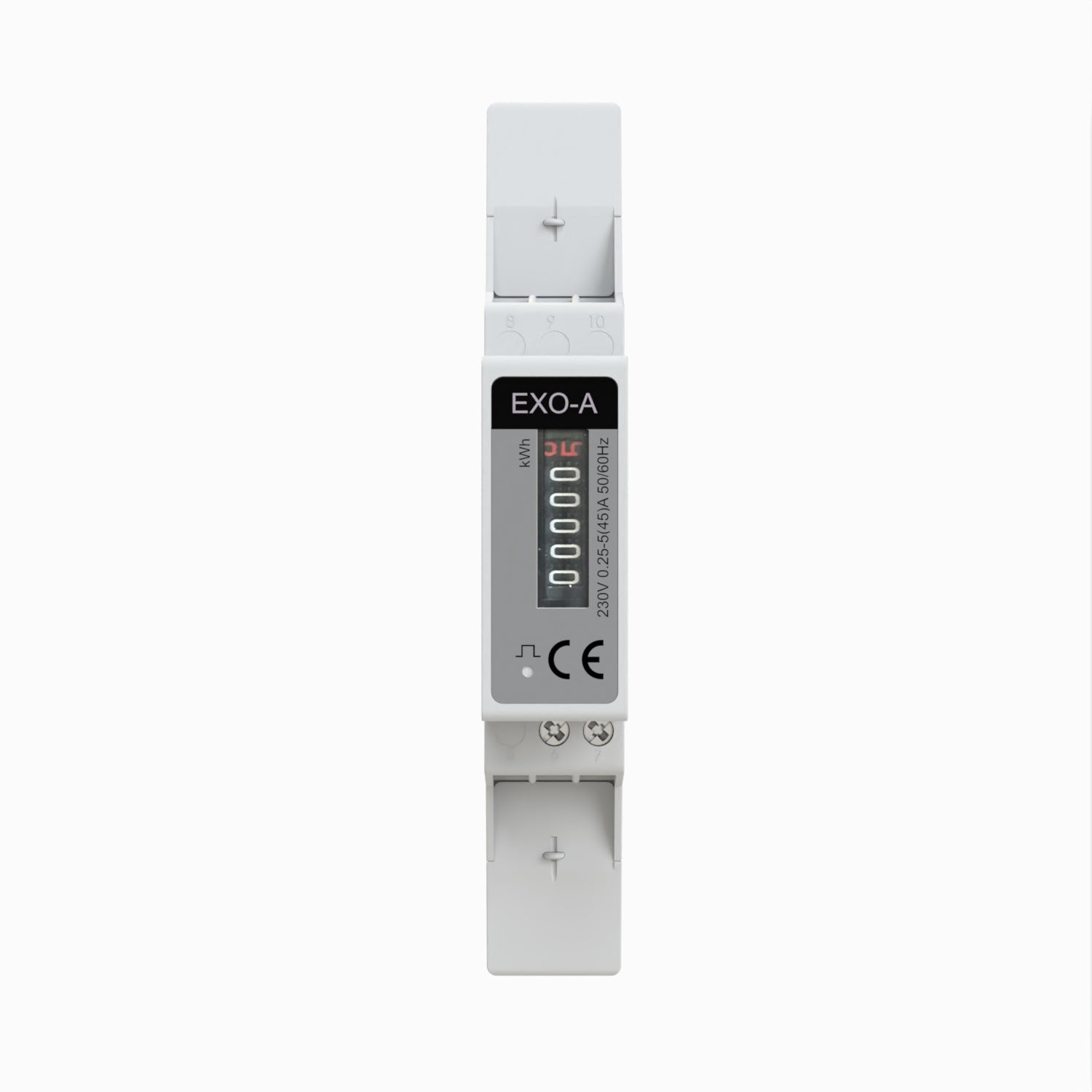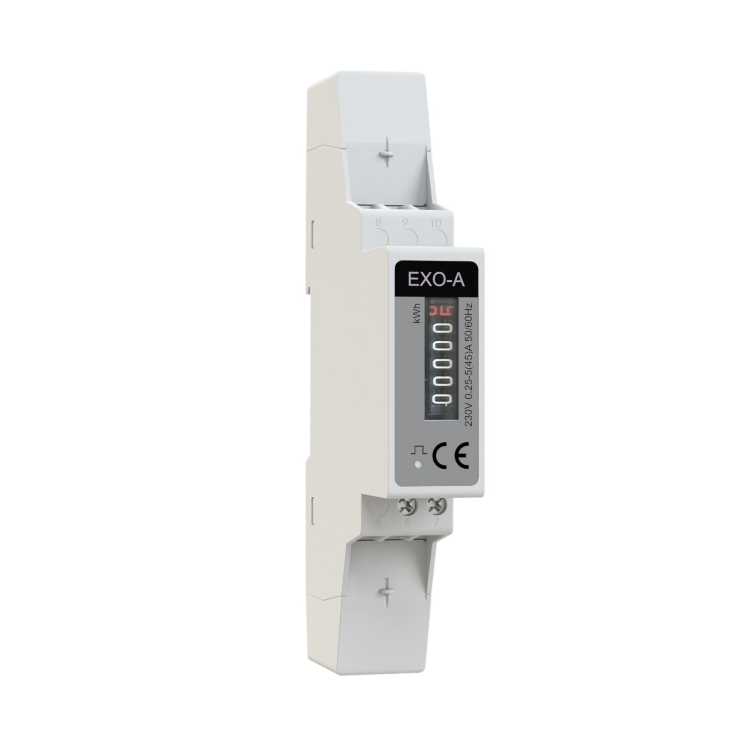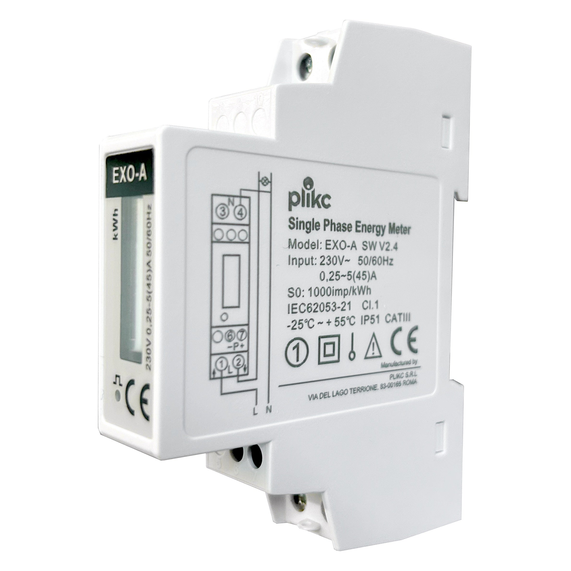 Plikc exo-A è un contatore di corrente meccanico monofase a 6 cifre (5+1), delle dimensioni di un modulo per guida DIN.