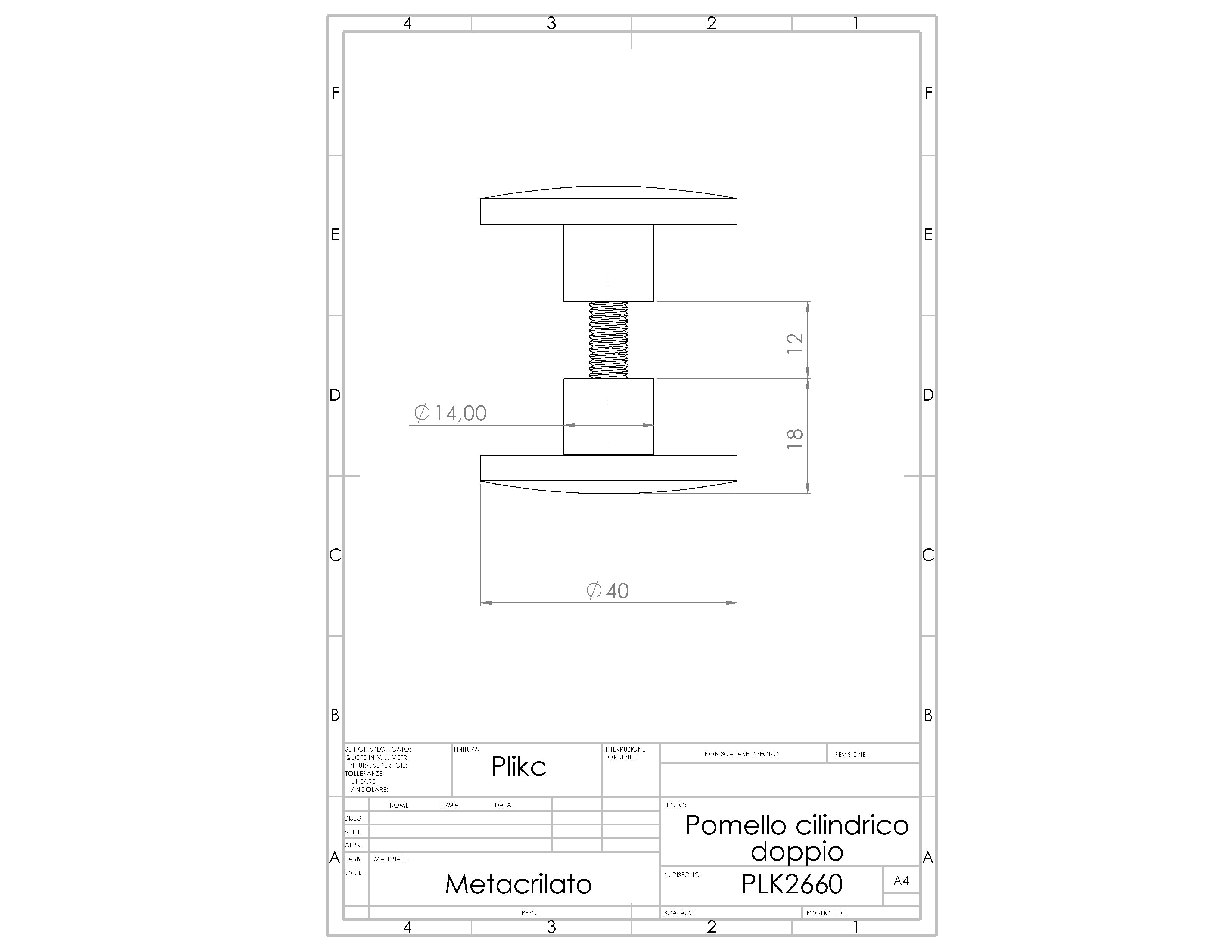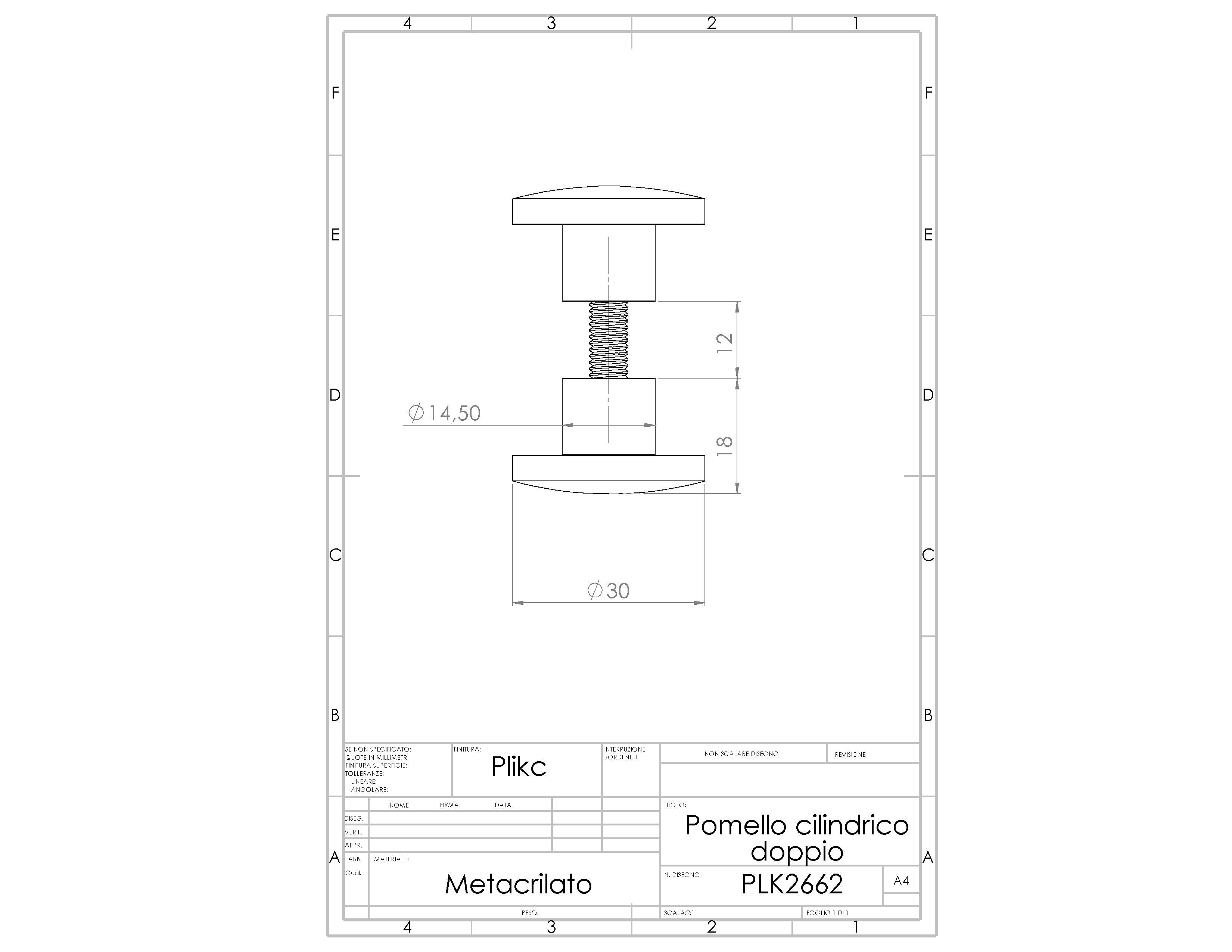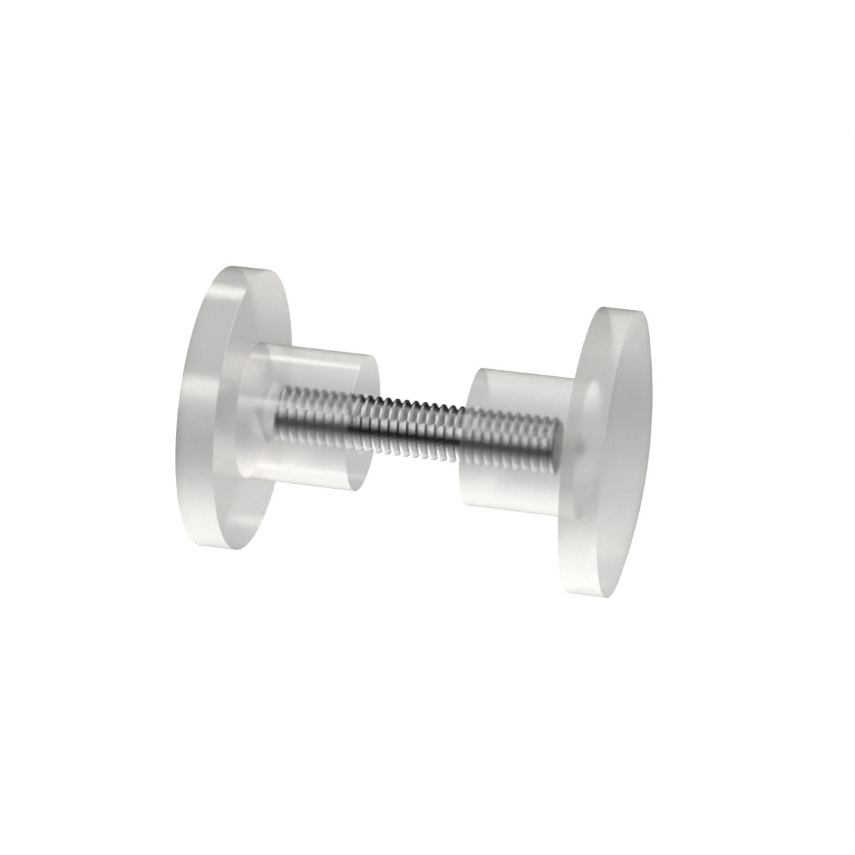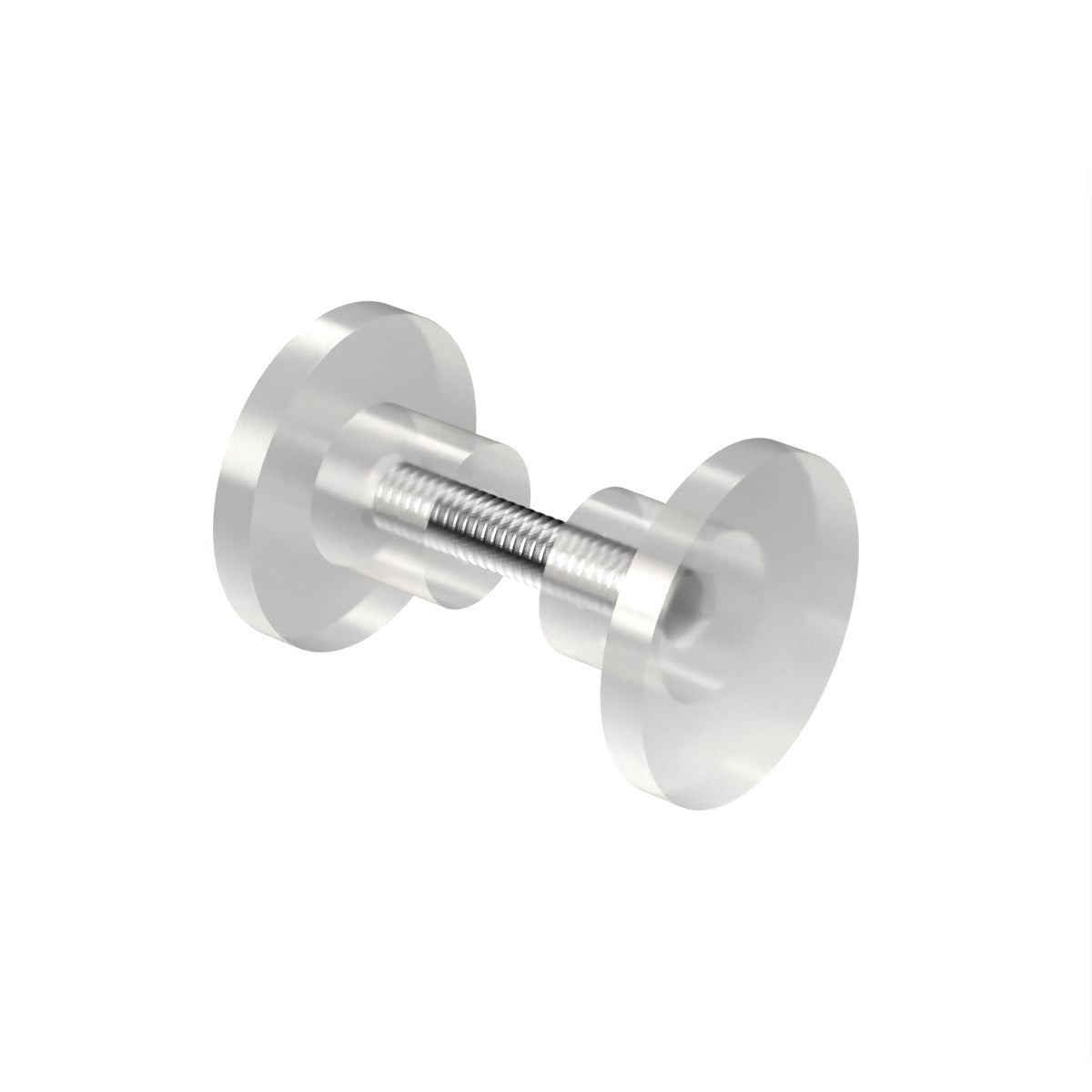 Pomello cilindrico doppio con battuta in metacrilato e barra filettata in ottone nichelato per vetri di spessore da 4 a 12 mm.