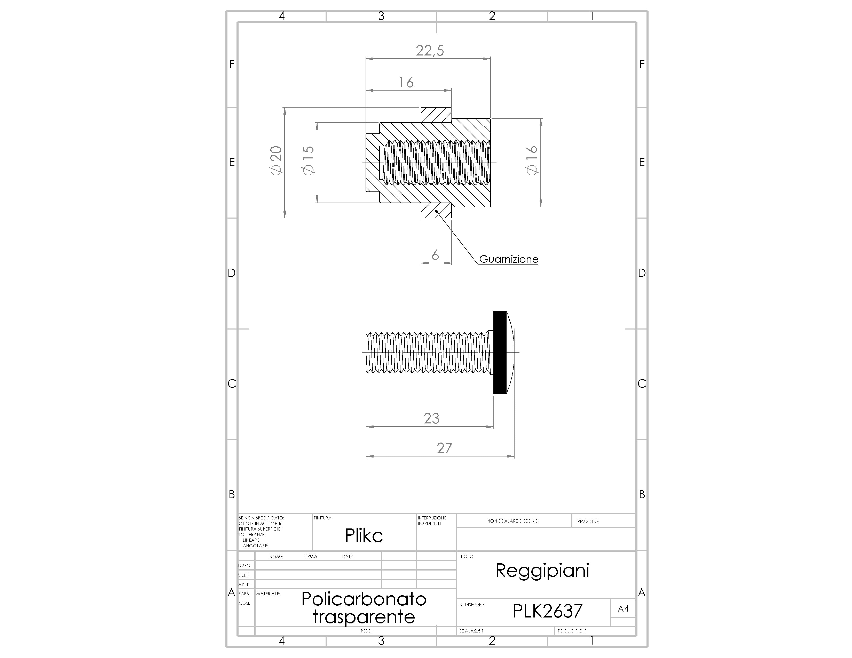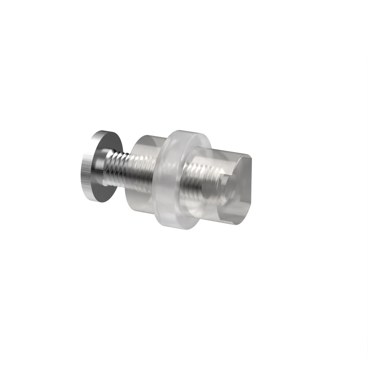 Reggipiani cilindrico per vetri in policarbonato trasparente completo di guarnizione in PVC antiscivolo e vite in ottone nichelato.